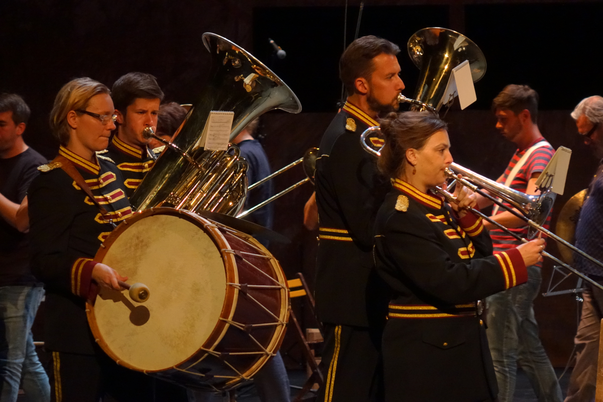 Zum Auftakt des internationalen Performing-Arts-Festival Foreign Affairs im Haus der Berliner Festspiele zelebriert die Produktion En avant, marche! von Regisseur Frank Van Laecke, Spitzenchoreograf Alain Platel und Komponist Steven Prengels die künstlerische Gemeinschaft in Form einer traditionellen Blaskapelle in Uniform, nicht ohne die Klischees musikalisch ordentlich gegen den Strich zu bürsten und ironisch zu verfremden.
